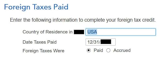 The foreign taxes paid is reported in Box 7 on the 1099-DIV form you receive from your broker. It’s easy to handle when the total foreign taxes paid from all your 1099-DIV forms is no more than a certain amount — $300 for single, $600 for married filing jointly. You enter the 1099-DIV forms into your tax software and the software will automatically put the total on your tax form (Schedule 3, Line 1).