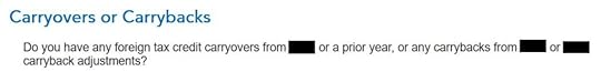 We don’t have any carryover from previous years. A carryover is created when you paid more in foreign tax than the tax credit you’re allowed. Your leftover foreign tax paid is first carried back to the previous year and then carried over to the following year.