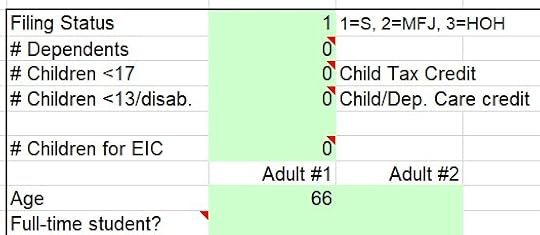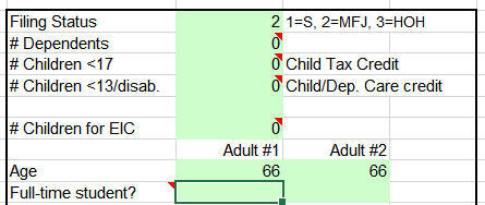 Age and Filing StatusClick on the Calculations tab at the bottom of the spreadsheet. First, you enter your filing status, your number of dependents, and ages in green-shaded cells starting at cell G2.
