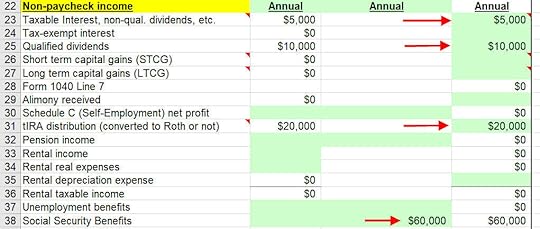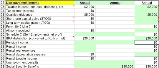 Next, you enter your income. Because the couple in our scenario are both retired, we skip the paycheck items and go down to the non-paycheck income starting at cell D23. You only input into cells shaded in green. Use annual numbers here.