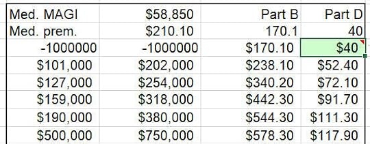 The first spike in the marginal tax rate (the gray line) is the so-called “tax torpedo.” The next four spikes are due to Medicare IRMAA. Point your mouse at points before each jump in the blue line. You’ll see the total Traditional IRA withdrawals and the cumulative tax rate associated with each jump. Subtract the baseline Traditional IRA withdrawals for living expenses from the total Traditional IRA withdrawals to get the amount for Roth conversion.