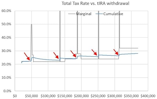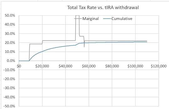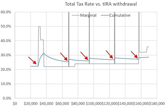 It shows that converting about $25,000 (to take the total withdrawal from Traditional IRAs to $45,000) will incur a marginal tax rate of about 22%. Then the marginal tax rate spikes up to 50% before it settles down to 22% again when the total withdrawals hit about $55,000.