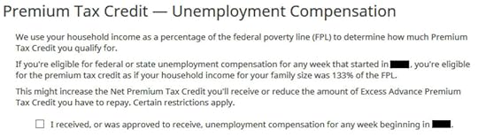 This is a special deal in only 2020 and 2021. If you received unemployment compensation for only one week in the year, you get free (or nearly free) health insurance for the entire year. We didn’t receive unemployment.