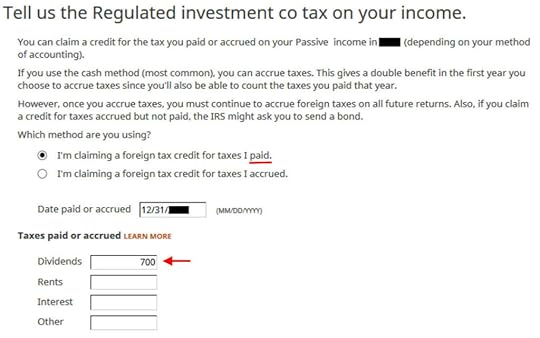 I chose the simpler “paid” method. Enter the end of the year as the date paid. Enter the total foreign tax paid into the Dividends box. If you have multiple 1099-DIV’s that reported foreign tax paid in Box 7, you’ll have to add up those numbers yourself. I wish the software should’ve done the math and auto-populated this field.