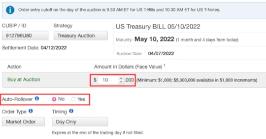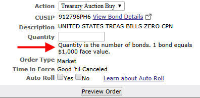 Treasuries are sold in $1,000 increments in a brokerage account. Enter a quantity of 1 if you’d like to buy $1,000 worth. It will cost slightly less than $1,000 when it’s all said and done. Fidelity lets you set up Auto Roll to automatically buy another Treasury of the same term when this Treasury matures. It’s convenient when you’re investing in short-term Treasury Bills.