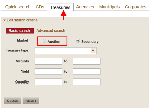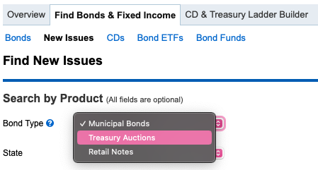 Click on the Treasuries tab and then the Auction radio button. Be sure to select “Auction.” You pay no extra fee only when you buy a new issue.
