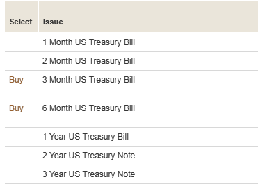 You’ll see a list of upcoming issues in the Treasury section. If you don’t see anything for the term you’d like to buy, check the calendar from U.S. Treasury and come back within your order window.