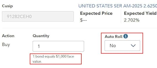 Treasuries are sold in $1,000 increments in a brokerage account. Enter a quantity of 1 if you’d like to buy $1,000 worth. It will cost slightly less than $1,000 when it’s all said and done. Fidelity lets you set up Auto Roll to automatically buy another Treasury of the same term and the same amount when this Treasury matures. It’s convenient when you’re investing in short-term Treasury Bills.