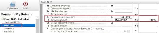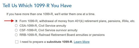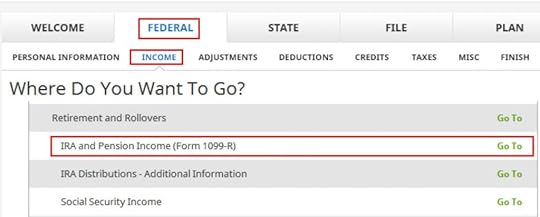 Click on Federal -> Income. Scroll down and find IRA and Pension Income (Form 1099-R). Click on “Go To.”