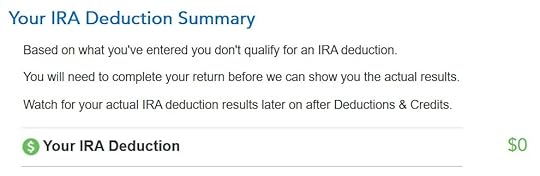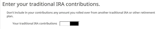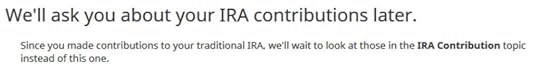 A summary of your contributions. 0 in Traditional IRA deduction means it’s nondeductible. Click on Next. Repeat for your spouse if both of you contributed to a Traditional IRA for the previous year.