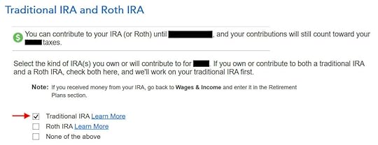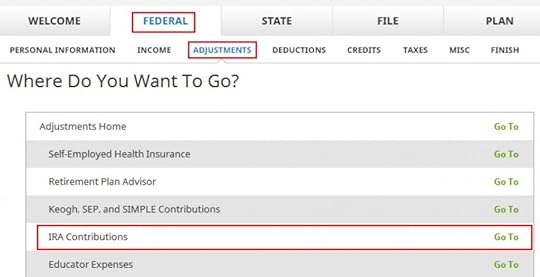 Click on Federal -> Adjustments. Find IRA Contributions. Click on “Go To.”