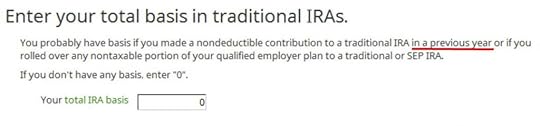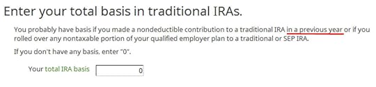 Enter zero if this is the first year you contributed to a Traditional IRA. If you contributed non-deductible for previous years (regardless of when), enter the number on line 14 of your Form 8606 from last year.