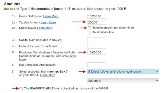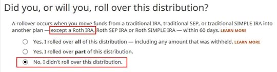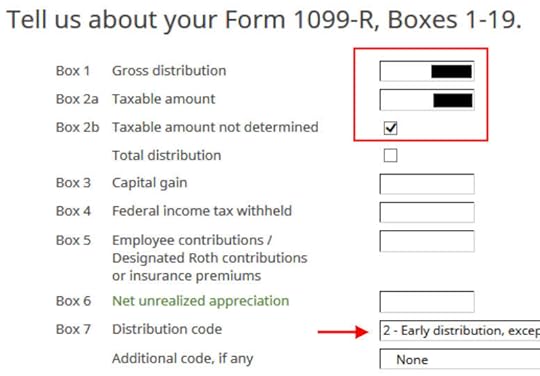 If you imported your 1099-R, double-check to make sure the import exactly matches the copy you received. If you enter your 1099-R manually, be sure to enter everything on the form exactly. Box 1 shows the amount converted to the Roth IRA. It’s $7,200 in our example. It’s normal to have the same amount as the taxable amount in Box 2a when Box 2b is checked saying “taxable amount not determined.” Pay attention to the distribution code in Box 7. It should be code 2 when you’re under 59-1/2 and code 7 when you’re over 59-1/2.