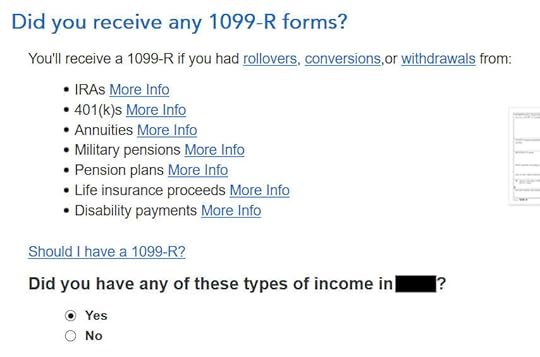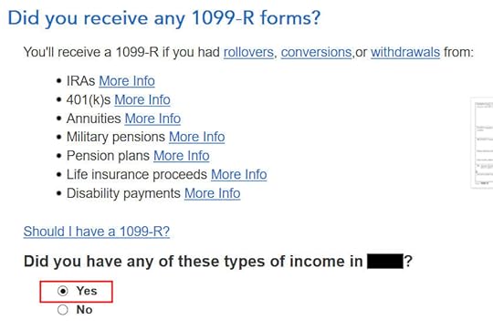 Enter 1099-RWhen you convert the Traditional IRA to Roth, you receive a 1099-R form. Complete this section only if you converted *during* 2024. If you only converted in 2025, you won’t have a 1099-R until next January. Please follow Split-Year Backdoor Roth in H&R Block, 1st Year now and come back next year to follow Split-Year Backdoor Roth in H&R Block, 2nd Year. If your conversion during 2024 was against a contribution you made for 2023 or a 2023 contribution you recharacterized in 2024, please follow Split-Year Backdoor Roth in H&R Block, 2nd Year.