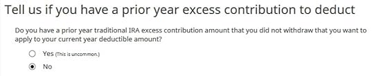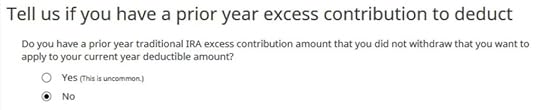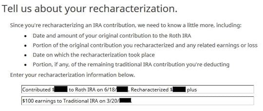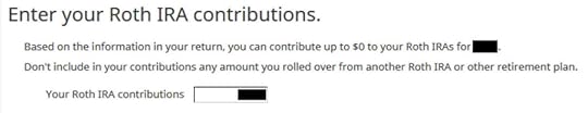 This is as expected. 0 in Traditional IRA deduction means it’s nondeductible. Click on Next. Repeat for your spouse if both of you contributed to a Roth IRA for the previous year and then recharacterized in the following year.