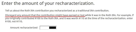 The amount here is relative to the original contribution amount. If you recharacterized the whole thing, enter $7,000 in our example, not $7,100 which was the amount with earnings that the IRA custodian moved into the Traditional IRA.