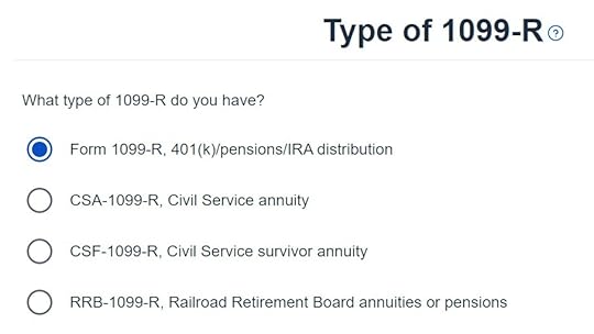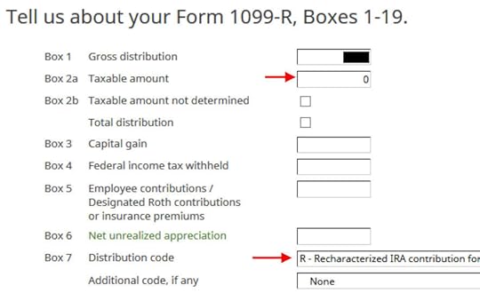 We handle the 1099-R form for recharacterization first. This 1099-R form has a code “R” in Box 7.