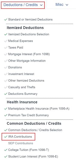 Find the “IRA Contributions” section under the “Deductions / Credits” menu.