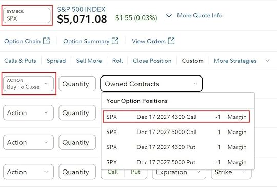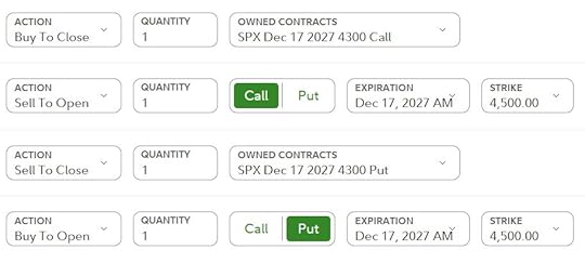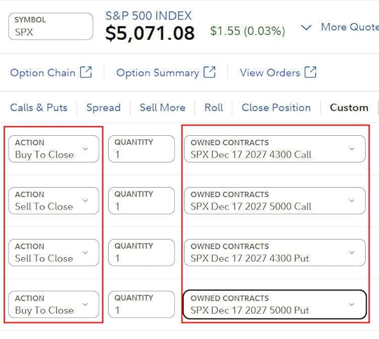 Buy to Close a call on SPX in December 2027 at 4,300Sell to Close a call on SPX in December 2027 at 5,000Sell to Close a put on SPX in December 2027 at 4,300Buy to Close a put on SPX in December 2027 at 5,000Buy – Sell – Sell – Buy.