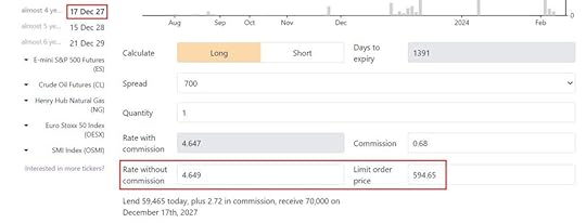 Boxspreads.com showed that if I wanted a 4.65% yield (0.25% above Treasury), the target price for a 700-point spread in December 2027 was 594.65.