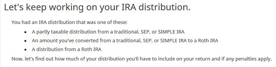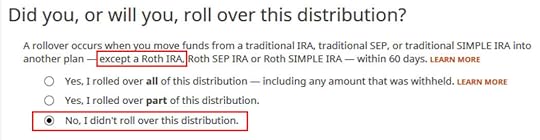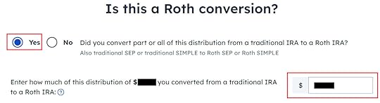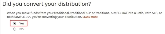 You are done with this 1099-R for the conversion. Repeat if you have another 1099-R. If you’re married and both of you converted to Roth, pay attention to whose 1099-R it is when you enter the second one. You’ll have problems if you assign both 1099-R forms to the same person when they belong to each spouse. Click on “No, Continue” when you have entered all the 1099-R forms.
