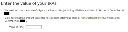 This is another important question. If you emptied out all your Traditional IRA and you don’t have any SEP or SIMPLE IRAs, technically you can answer Yes and skip some questions. The safer bet is to answer No and go through the follow-up questions. If you’ve been going through these screens back and forth, you may have put in some incorrect answers in a previous round. You will have a chance to review and correct those answers only if you answer No.