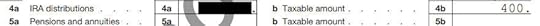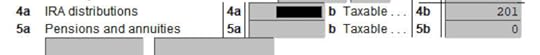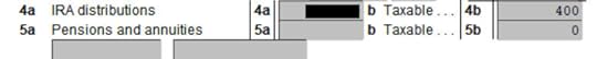 Taxable IncomeYou’re done with the two 1099-R forms. Let’s look at how they show up on your tax return. Click on Forms on the top and open Form 1040 and Schedules 1-3. Click on Hide Mini WS. Scroll down to lines 4a and 4b.