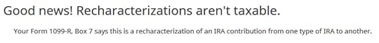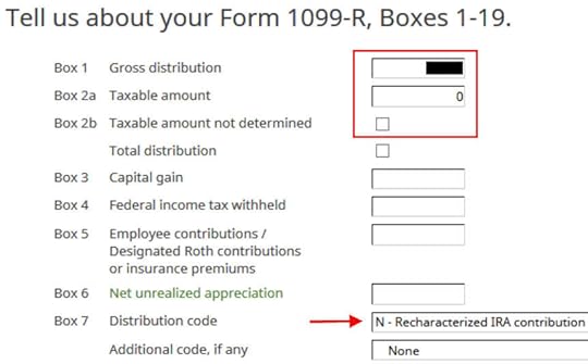 We handle the 1099-R form for recharacterization first. This 1099-R form has a code ‘R’ in Box 7.