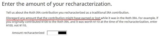 This is as expected. 0 in Traditional IRA deduction means it’s nondeductible. Click on Next. Repeat for your spouse if both of you contributed to a Roth IRA for the previous year and then recharacterized in the following year.