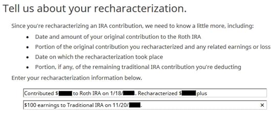 I’m showing two examples — (1) a direct contribution to a Traditional IRA for the previous year; and (2) recharacterizing a Roth contribution for the previous year as a Traditional contribution. Please see which example matches your scenario and follow along accordingly.