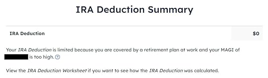 It tells us we don’t get a deduction because our income is too high. If you see a deduction here it means the software thinks your income qualifies for a deduction, which may or may not be correct. Please see the Troubleshooting section.