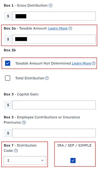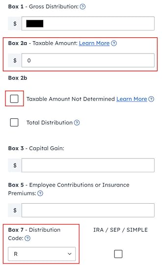 Box 1 shows the amount converted to Roth. If you contributed to a Traditional IRA for 2023 in 2023 and converted in 2023 (a “clean” backdoor Roth) on top of converting the 2022 contribution in 2023, the amount on the 1099-R includes two years’ worth of contributions. It’s normal to have the same amount as the taxable amount in Box 2a when Box 2b is checked saying “taxable amount not determined.” Make sure to choose the correct code in Box 7 to match your 1099-R. The “IRA / SEP / SIMPLE” box is checked.