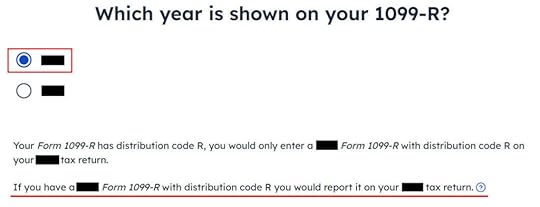 Self vs SpouseIf you are married, make sure you don’t have the 1099-R and the IRA contribution mixed up between yourself and your spouse. If you inadvertently assigned two 1099-Rs to one person instead of one for you and one for your spouse, the second 1099-R will not match up with a Traditional IRA contribution made by a spouse. If you entered a 1099-R for both yourself and your spouse but you only entered one Traditional IRA contribution, you will be taxed on one 1099-R.