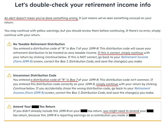 FreeTaxUSA shows some alerts. The zero taxable income on the 1099-R is correct. Code “R” in Box 7 is also correct. Although you didn’t include this 1099-R last year because you didn’t have it at that time, you don’t need to amend last year’s tax return if you reported the recharacterization in a different way when you followed Split-Year Backdoor Roth IRA in FreeTaxUSA, 1st Year. You may need to amend last year’s return only if you didn’t report the recharacterization last year at all.