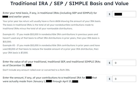 H&R Block should import this from last year’s data but it doesn’t. Get it from last year’s Form 8606 Line 14. If you didn’t have a Form 8606 last year because the software gave you a deduction on Schedule 1 Line 20, your basis is zero. It’s $6,000 in our example.