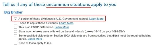 After you import or enter the 1099-DIV form in TurboTax download software, you need to check a box to say that a portion of the dividends is U.S. Government interest. It’s easy to miss because TurboTax says it’s uncommon, which isn’t true.
