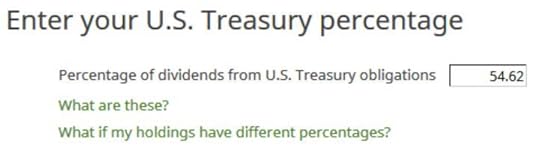 This shows up only if you check that box on the previous screen. Instead of asking for a dollar amount, H&R Block goes by percentage. It forces you to do a bit of math. In our example, $3,550 from Treasuries divided by $6,500 total ordinary dividends is 54.62%. So we enter 54.62.