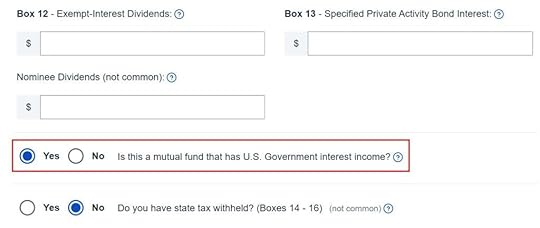 The question “Is this a mutual fund that has U.S. Government interest income?” isn’t accurate. A 1099-DIV form from a brokerage account includes dividends from all holdings. It isn’t a mutual fund that has U.S. Government interest income. The correct question should be “Does this include U.S. Government interest income?” Answer “Yes” anyway.
