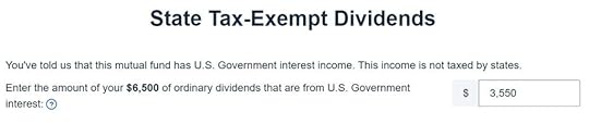 Instead of asking for a dollar amount, H&R Block goes by percentage. It forces you to do a bit of math. In our example, $3,550 from Treasuries divided by $6,500 total ordinary dividends is 54.62%. So we enter 54.62.