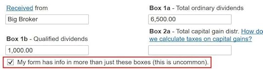 H&R Block download software shows a checkbox at the bottom of the 1099-DIV entries. This field doesn’t come in the import. It’s easy to miss because it’s at the bottom of a long form. You have to really look for it.