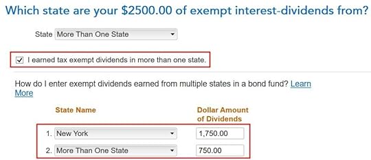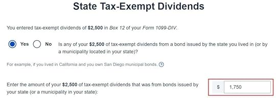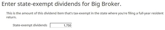 Repeat this process for every 1099-DIV. H&R Block software will keep a tally of your state tax-exempt dividends.