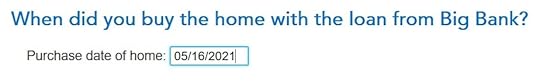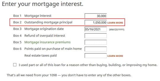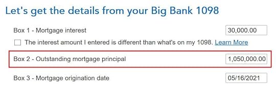 You also need to enter the date when you purchased the home in Box 3. This date determines whether you have a $1 million limit or a $750,000 limit for the mortgage interest deduction. If this mortgage was from a refinance and the bank put the refinance date in Box 3, you should overwrite it with the date when you originally bought the home.