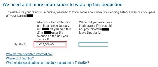 Granted that TurboTax doesn’t cover all situations but at least it makes an attempt to cover the most common scenario (only regular payments without extra principal payments). H&R Block just uses a wrong number without telling you. That’s bad. Although only a small percentage of people deduct their mortgage interest now, among those who can still deduct, many have a mortgage above the limit.