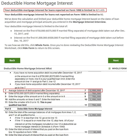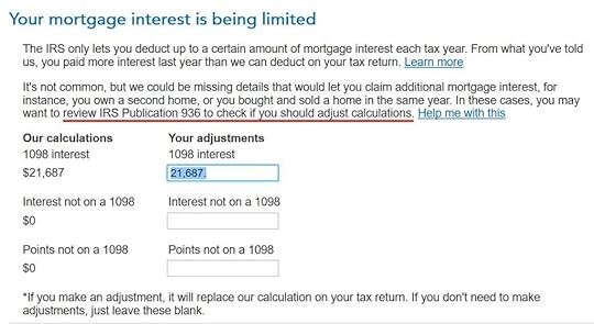 After answering some more questions about points and mortgage insurance premiums, which we don’t have, H&R Block says we can deduct 100% of the mortgage interest paid. This can’t be right. We entered a balance above $1 million on the 1098 form. H&R Block just uses the interest paid number from the 1098 form as if the loan limit doesn’t exist.