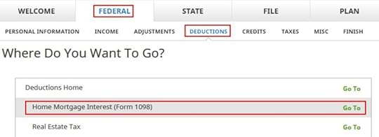 Find “Home Mortgage Interest (Form 1098)” under Federal -> Deductions.