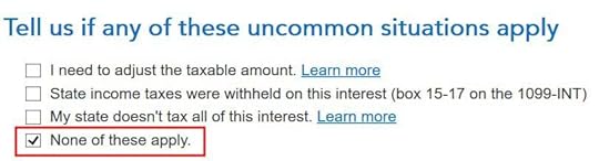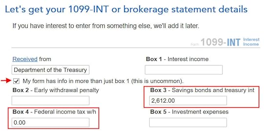 H&R Block download software shows a checkbox at the bottom of the 1099-DIV entries. This field doesn’t come in the import. It’s easy to miss because it’s at the bottom of a long form. You have to really look for it. Although the wording gives the impression of saying 100% of the dividends came from U.S. Treasury obligations, checking it only says that a part of the dividends came from U.S. Treasury obligations. Check the box and click on Next.