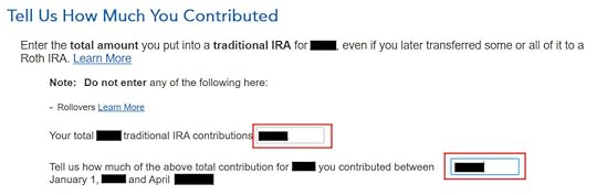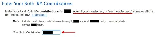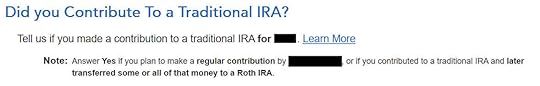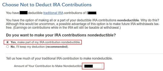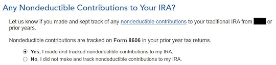 When you contribute for the previous year and convert (or recharacterize and convert in the following year), you have to report them on your tax return in two different years: the contribution in one year and the conversion in the following year. It’s more confusing than a straight “clean” backdoor Roth but that’s the price you pay for not knowing the right way. This post shows you how to do the contribution part in TurboTax for the first year. The follow-up post Backdoor Roth in TurboTax: Recharacterize & Convert, 2nd Year shows you how to do the conversion part in TurboTax for the second year.