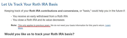 If you take up this offer from TurboTax to track your Roth IRA basis, it’s going to ask you questions about previous years, which is more trouble than it’s worth to me. I answered No. You don’t need to track your Roth IRA basis if you’re planning to withdraw from your Roth account only after age 59-1/2 and after you’ve had a Roth IRA for five years. See Roth IRA Withdrawal After 59-1/2 in TurboTax.