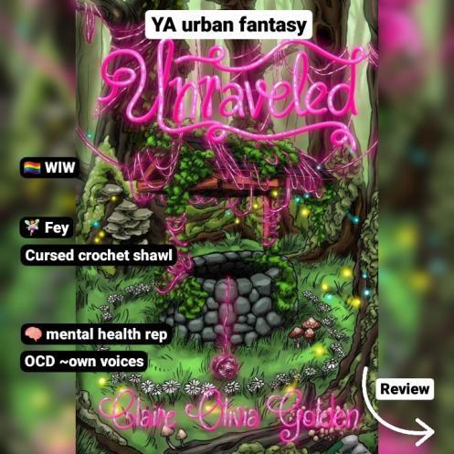 Claire Olivia Golden’s UNRAVELED is a sapphic urban fantasy with fae and a cursed crochet shawl. It has OCD and mental illness rep — own voices — and it’s just so good ♡ as a bonus, it also features the crochet pattern at the back so you can make your own (not) cursed shawl