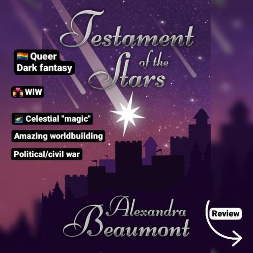 Alexandra Beaumont’s TESTAMENT OF THE STARS is a sapphic dark fantasy featuring celestial “magic” (they (ab)use fallen stars) and delicious worldbuilding. It deals with political/civil war and it’s a real rollercoaster ♡ I still want to live in one of the cities of that book